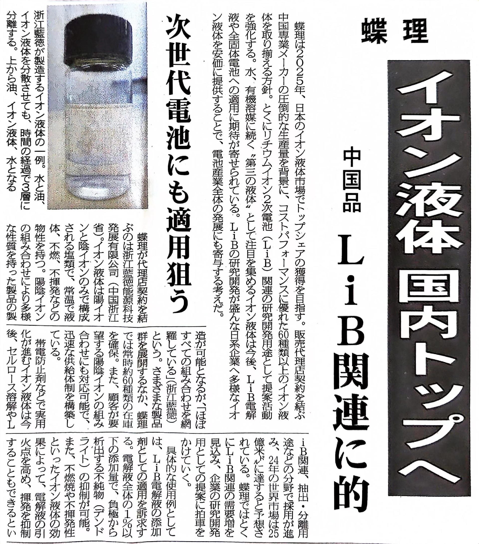 لقد حظيت نتائج الأبحاث المتقدمة التي حققتها شركة Ldet Technology في مجال الطاقة الجديدة بتقدير كبير وإشادة من قبل صحيفة الصناعة الكيميائية اليابانية اليومية. وأشار التقرير إلى أن المنتجات السائلة الأيونية من Ldet Technology توفر أفكارًا وطرقًا جديدة لتطوير إلكتروليتات بطاريات الطاقة الجديدة، مما سيساعد في تعزيز التطور السريع لصناعة الطاقة الجديدة العالمية.